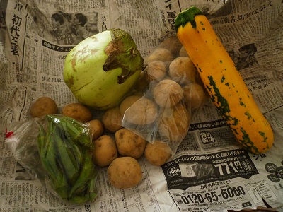 川に傷がある白い茄子は50円、大きなズッキーニは150円、新じゃがいもはつめ放題で200円、オクラはなんと100円!
