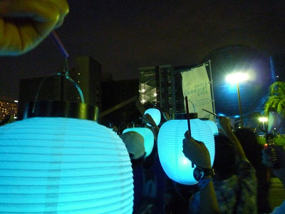 オアシス21の芝生エリアで1000人が集まります。オアシス21の建物と光がシンクロしてとってもキレイ。心も明るくなります。