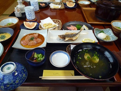 旅館の朝食っておいしいな。朝釣りの父親は船酔いでダウン。