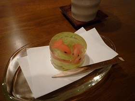 「寿」を記したおまんじゅうとおしどり夫婦の和菓子はお土産にいただきました。おいしいの。