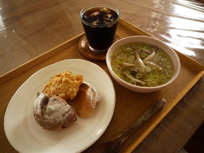 パンは実家近所のパン屋さんのパン。くるみの香りがとっても美味しかったです。小さくマルマルして可愛いパンでした。