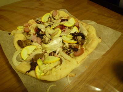 実家でよく食べる和風ピザ。トマト味ではなくしょうゆ味。紅ショウガをいれるのがポイントです。