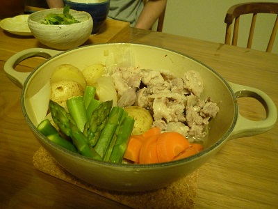 今日も疲れて帰るだろうから、朝に全部夕食を作って出かけました。ニンジンとアスパラは別茹でしたので色がきれいでしょ。アスパラは北海道からの贈り物。ソンじゃそこらで食べられる味ではない。太いのにすじがわからないです。