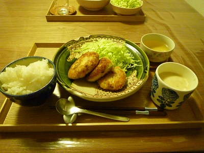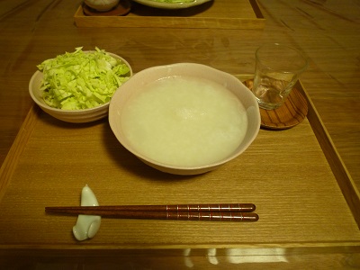というものの、昼から頭痛で寝込んだ私。微熱もあるし、昨日のバリウムの製でおなかはゴロゴロするし。健康診断に行くと体調を壊すのは歯は譲り。夕食は無理をしないでおかゆさんにしました。せっかくコロッケ頑張ったのに。