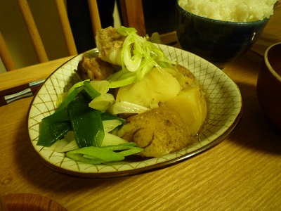 主人のために骨付きの豚肉で作った肉じゃがです。ルクルーゼで煮込むとジューシーさがUPします!