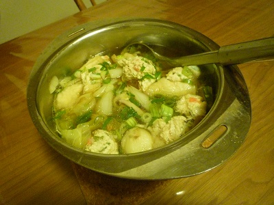 鶏団子はバーミックスで自分でひき肉にしました。残っていたせんべい汁のせんべいも入れました!