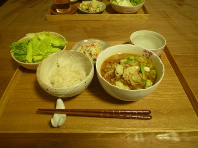 豚汁には豆板醤をいれてピリ辛にしました。野菜中心の夕食。主人には冷奴をつけました。