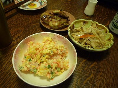 ポテトサラダは姉の手作り。煮なます、かきのソテーです。