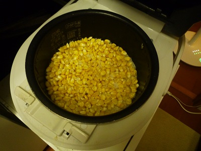 とうもろこし1本いれたコーンごはん。剥くのが大変なだけあって美味しさ倍増。少し塩を入れて炊くのがポイント。