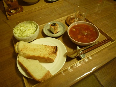 従業員食堂で初めてでた献立なのに。ということで主人にはミネステローネパスタ、わたしはホシノ酵母でやいたパンをいただきました。