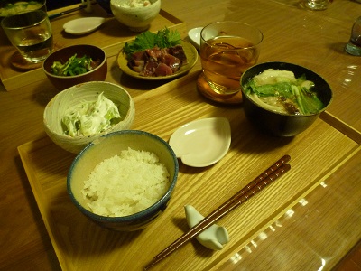 今日は偶然にも豪華なかつおのお刺身。祝賀会にはもってこいのメニューです。ジャガイモはお昼に出した蒸し器で蒸して作りました。