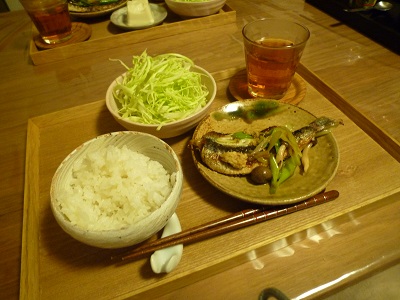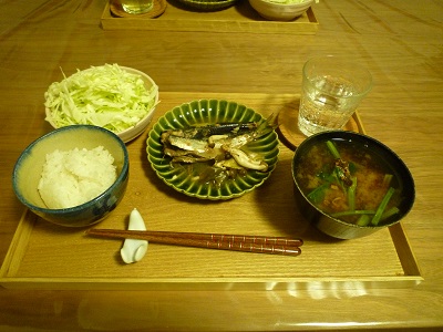 何とかつくった夕食。今日はお味噌汁はやめました。いわしはしょうがを利かしてくさみを消す&日本酒をつかいました。