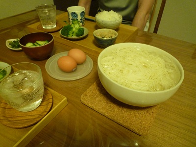 いただいた素麺、暑いのでいただきましたー。温泉玉子いれるなんて豪華でしょ。