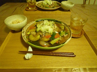 ということで冷蔵庫の大掃除をかねたあんかけ焼きそばです。なす・にんじん・玉ねぎ・きのこ・ねぎ・青梗菜と野菜たっぷり!