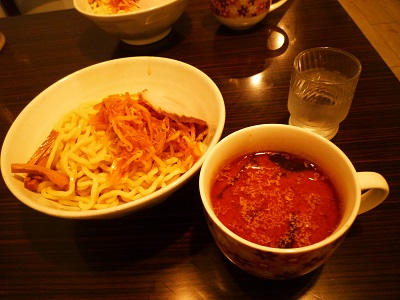トムヤムクンをつけ麺のタレにしたこのお店、blogにのつていて行きたかったのです。もちろん普通のつけ麺もあって辛いもの苦手な主人はつけ麺!17:30入店でお店は誰もいなく貸しきり状態でした。肝心の味は・・・最高に美味しいです!スープも普通のタイ料理のお店以上に美味しく、麺がとってももちもちしていて食べ応えがありました。さらに「とってのついたマグカップ」に入れたスープは想像以上に食べやすいです。もちろんれんげはなしです。