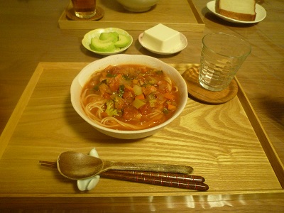 主人のリクエストで、ミネステローネにパスタをいれました。温まるし美味しいの。主人はつけパンも食べていました!