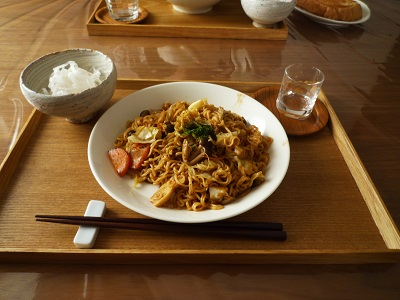 お昼はパンのつもりでいたけど気分は麺気分。ストックしていたインスタント焼きそばをつくりました。