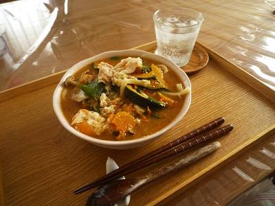 旅行後の野菜不足解消に、お野菜をたくさんいれたほうとう風うどんです。かぼちゃにきのこ、具沢山のお野菜にお味噌仕立てのスープがよく合います。もうそんなに暑くないから、こんなおうどんもつるつる食べられます。