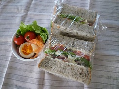 ①今日はゴマパンでサンドイッチです。ふかふかのサンドイッチお弁当、わたしもいただきたい。