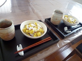 今日のポイントはさつまいもは蒸していれたこと。手間がかかりますが甘さがでてくれます。