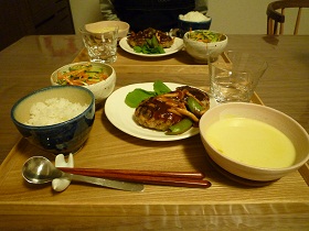 夕食はどこかディナーに行くつもりでしたが、夫が風邪気味と疲労で(久しぶりの残業が続いたので)また別の日に行くつもりです。夫リクエストにハンバーグを作りました。以前作ったときは半焼けだったので今回はリベンジ&レシピをみてちゃんと作りました。