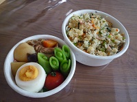 肉じゃがは前日に煮たものです。傷むといけないので冷蔵庫保管をして朝温めました。