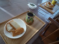 朝ごはんは大体パンです。ホームベーカリーのパンは日にちが経っても、レンジで温めればおいしいです。今日は昨日のたい焼きもプラスしてみました。コーヒーはドリップで入れています。