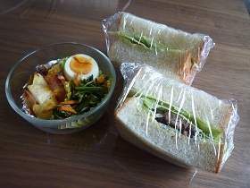 ①テレビで照り焼きハンバーガーが出ていたので刺激されてのサンドイッにはさみました。パンはあえて成型せずいつも食パンでつくりました。夫は喜んでいました☆