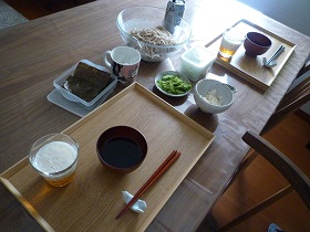 お昼はざるそばです。大葉にねぎ・とろろいもにごま、のりと薬味がたくさんです。