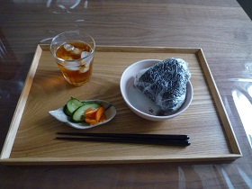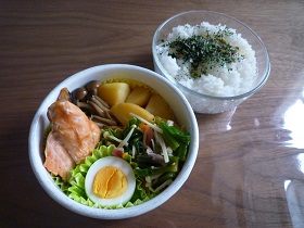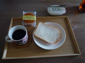 ②パンの耳の薄いのが1枚だけしかなかったので夫にはおにぎりです。炊き立てご飯のおにぎりは最高に美味しいと思います。贅沢な朝ごはんです。