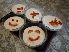 わたしのために「いちごのレアチーズケーキ」を姉と作ってくれたのです。そしてこのイチゴは姪の家のプランターで作ったものだそうです。すごいなぁ。ちなみに↓のレアチーズケーキの手前は「顔」だそう。笑っているイチゴのお顔と姪に癒された週末でした。